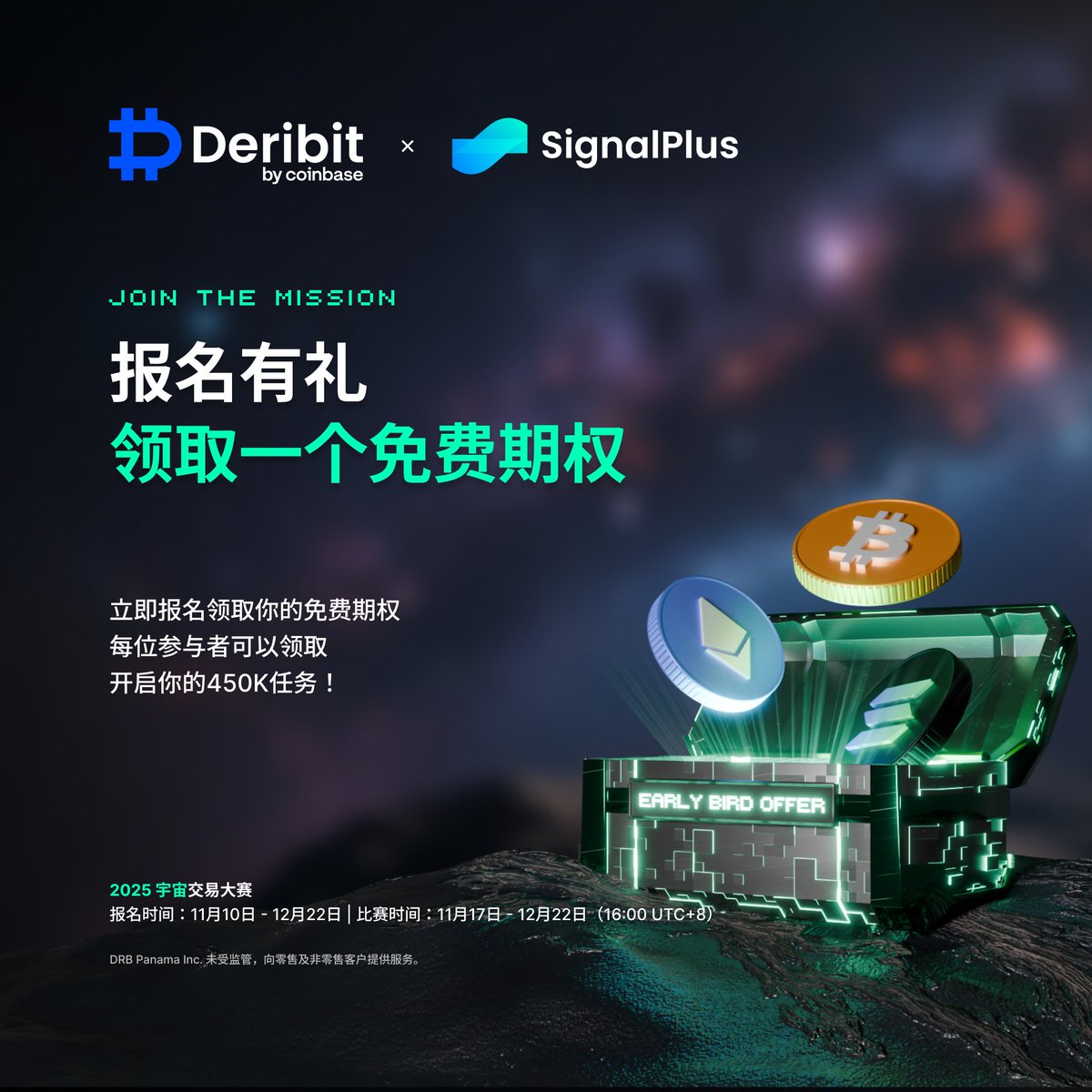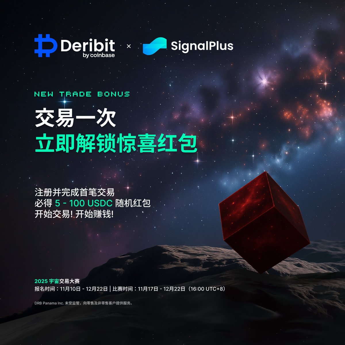 加密圈居然有零成本领期权的好事,不是噱头是真福利!只要参与Deribit × SignalPlus宇宙交易大赛,满足简单条件人人有份!🤩