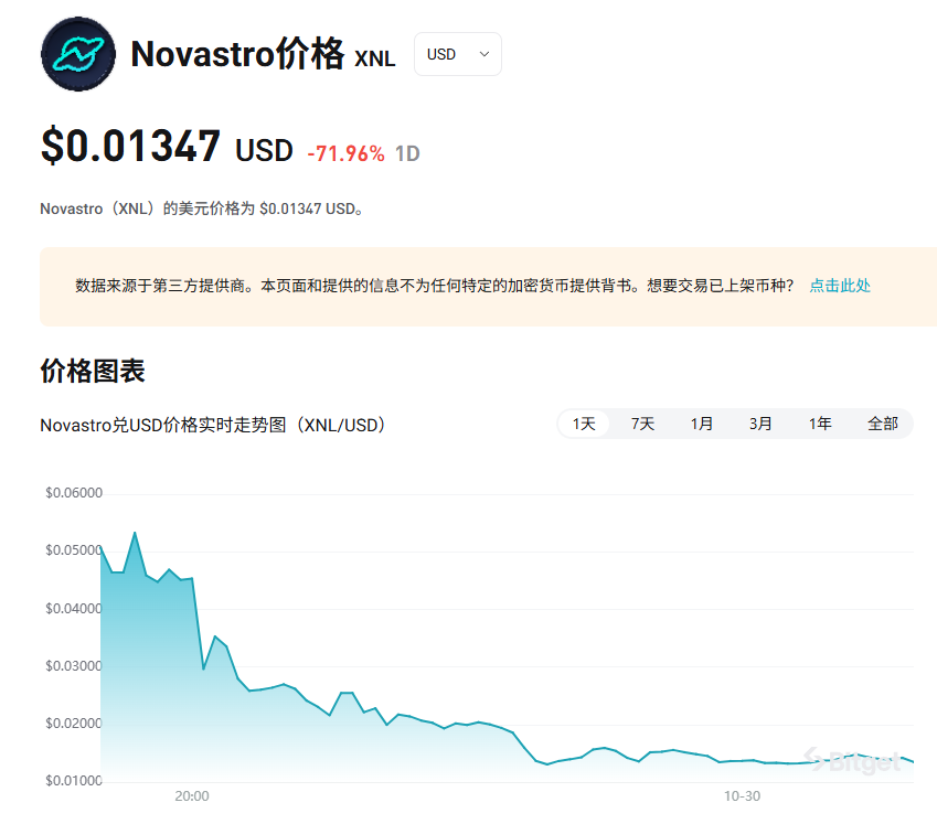 Kaito 上的 AI + RWA 项目 Novastro(XNL),上线破发 70%,从公募价 0.05 美元 直接跌到 0.013 美元。