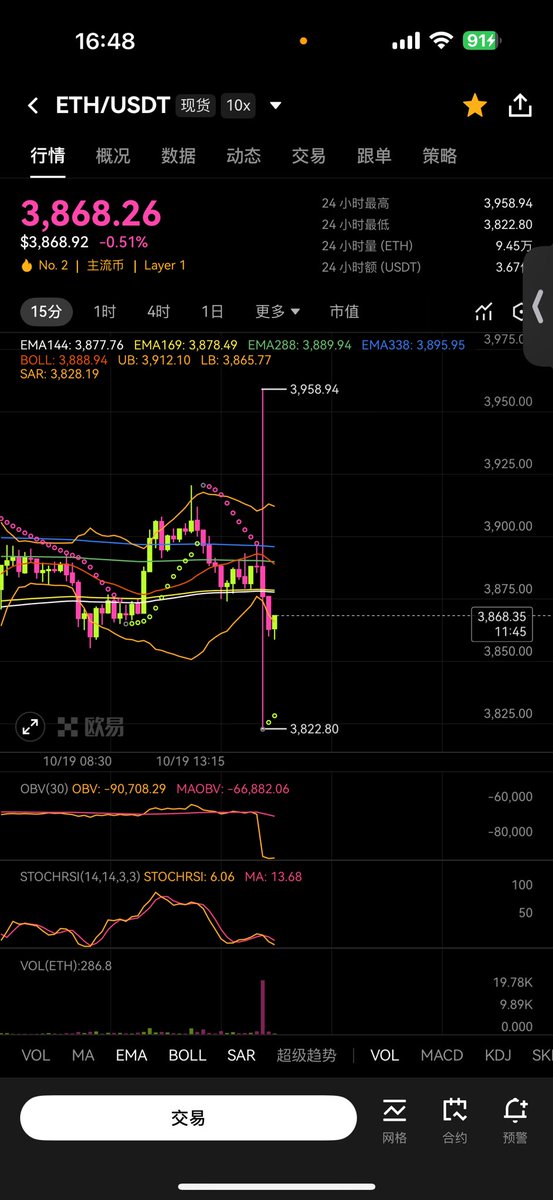 特朗普的关税言论引发了全球市场的恐慌,加密市场也进入了「避险模式」。以太坊在短时间内暴跌 16%,直接动摇了 USDe 赖以维持的平衡。但真正引爆 USDe 脱锚的,是币安平台上一家大型机构的爆仓。
