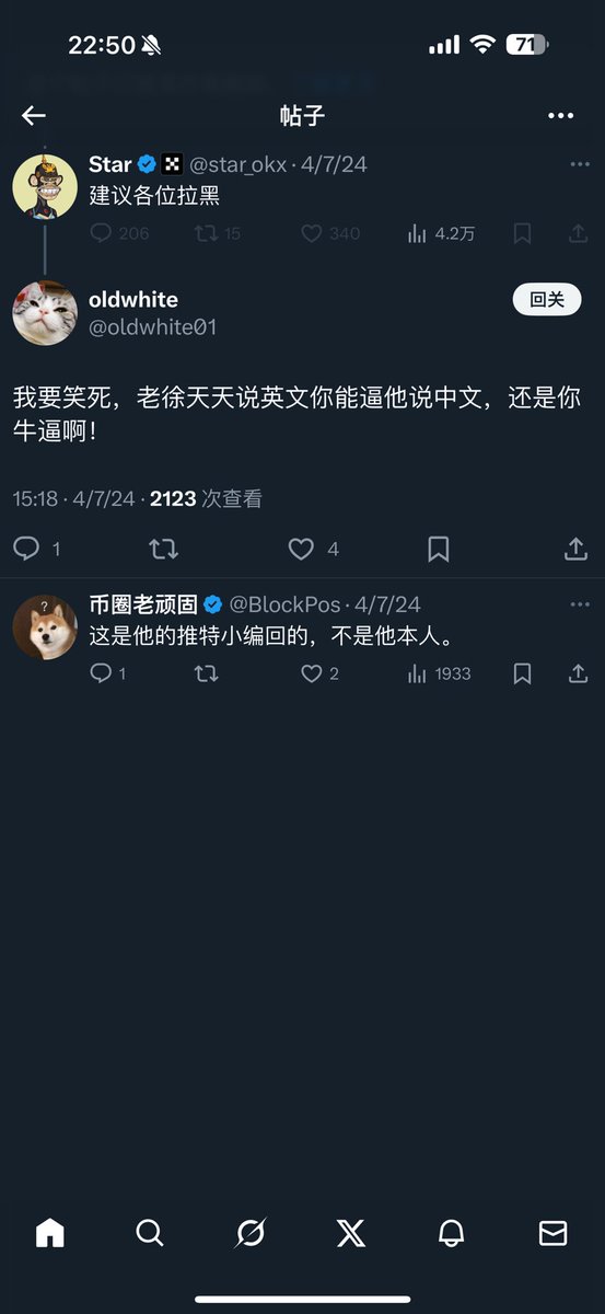 (比如上次爆仓之后,我发推说徐明星被抓了,都把他逼的出来说中文澄清了,参考推文: https://t.co/am81EjKvlt 亏钱了,骂两句解解气,直到今天推特还被@star_okx 屏蔽,如图1)