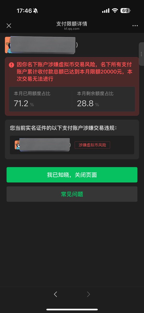 一位现实中的多年好友找我买点U,还不是刚加的陌生人,是已经好多年的朋友了,只是平时没事的时候不太联系而已,他用微信直接给我转账的,然后就如图所示被封控了。