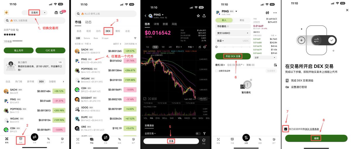 OKX 交易所内购买链上 meme 代币的功能全面开放了,把 OKX 升级到最新版本,即可按照下图开启交易所内的 DEX 功能。目前限时免 GAS 费用,并由 OKX 垫付。