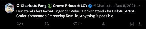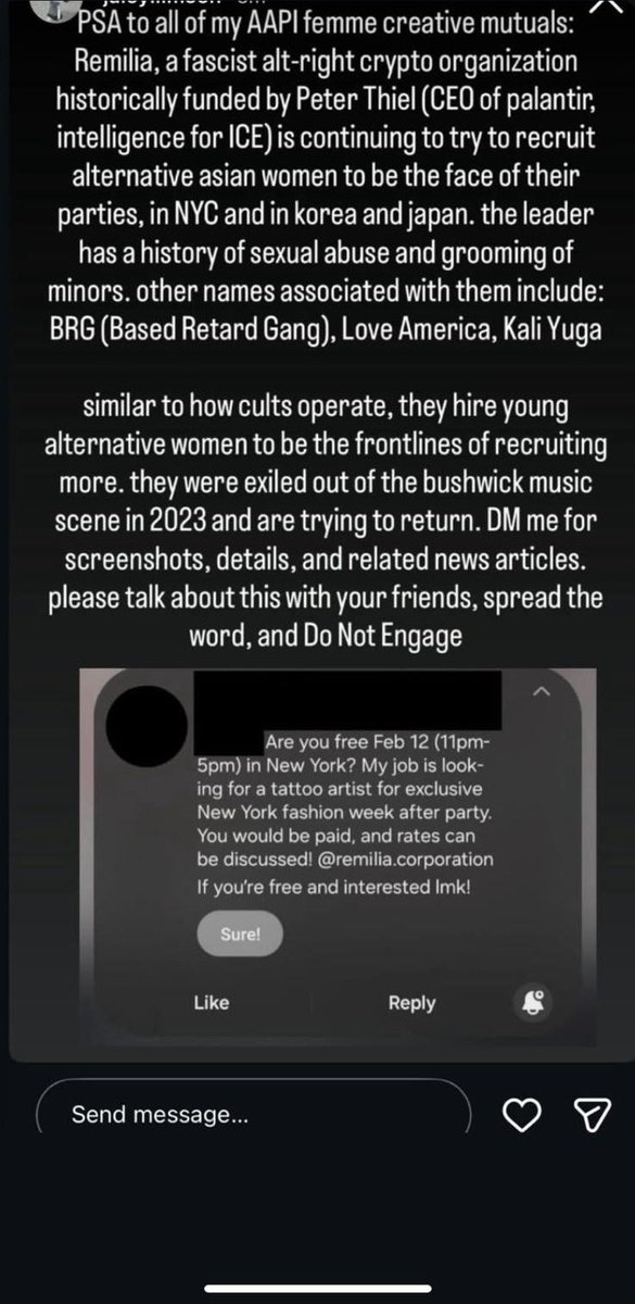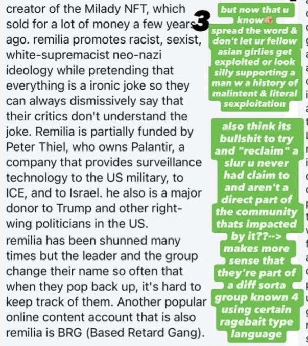 I wish they would do their research. Remilia is not interested in "Asian American Pacific Islanders" weedbrain tatooine brooklynite smudgie pudgies. We are interested in RCTA'ing american egirls into xiaohongshu egirls, neo-orientalism remixing east asian subculture through the same lens asia remixes us/uk culture, judeo-asian bene gesserit "hapa master race", and specifically the global diaspora chinese led fashion re-appraisal of turn of millennium Japanese style into contemporary cross-media global supply chain facilitated real world realization of otaku database culture, as a natural aesthetic/irl pair to the underground anarchist avant-garde dissident cultural revolution we represent online. Please learn the difference. These people are lost in the sauce spilled over from the pot we've spent the last half decade cooking, accidentally crossing into our scene they were never supposed to know about just by being so downstream from the influence of the trends we've ran up, turning around to gatekeep from outside the club they can't get into.