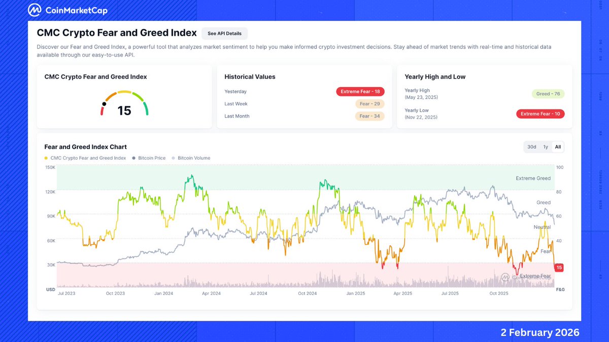 🔹 Currently at 15 (Extreme Fear), one of the lowest points of the cycle.