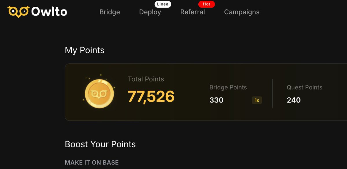 Owlto上线时间也拖了挺久的,早期跨链经常他们的路径顺带撸积分,用过可以查积分,顺带蹲个空投链接