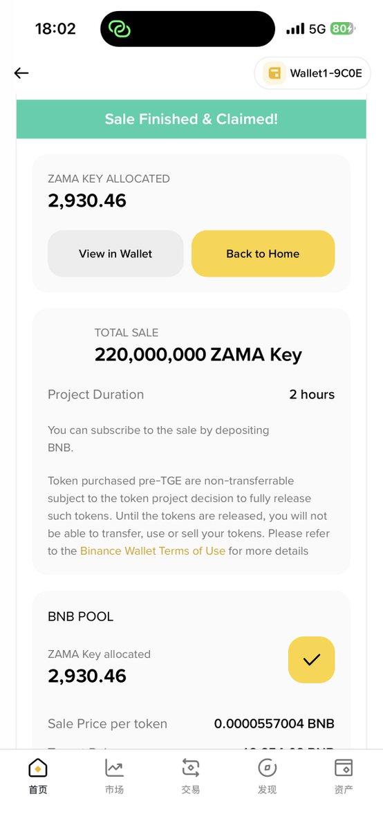 2. $ZAMA 待会 9 点上现货,币安打新这边充值到交易所账户了,单号给了 2930 + 2930 = 5860 枚 $ZAMA ,nft/公售轮/OKX Boost都开放领取了,这会链上盘前 $0.04 ,我出了部分剩下的等现货,大家自己选