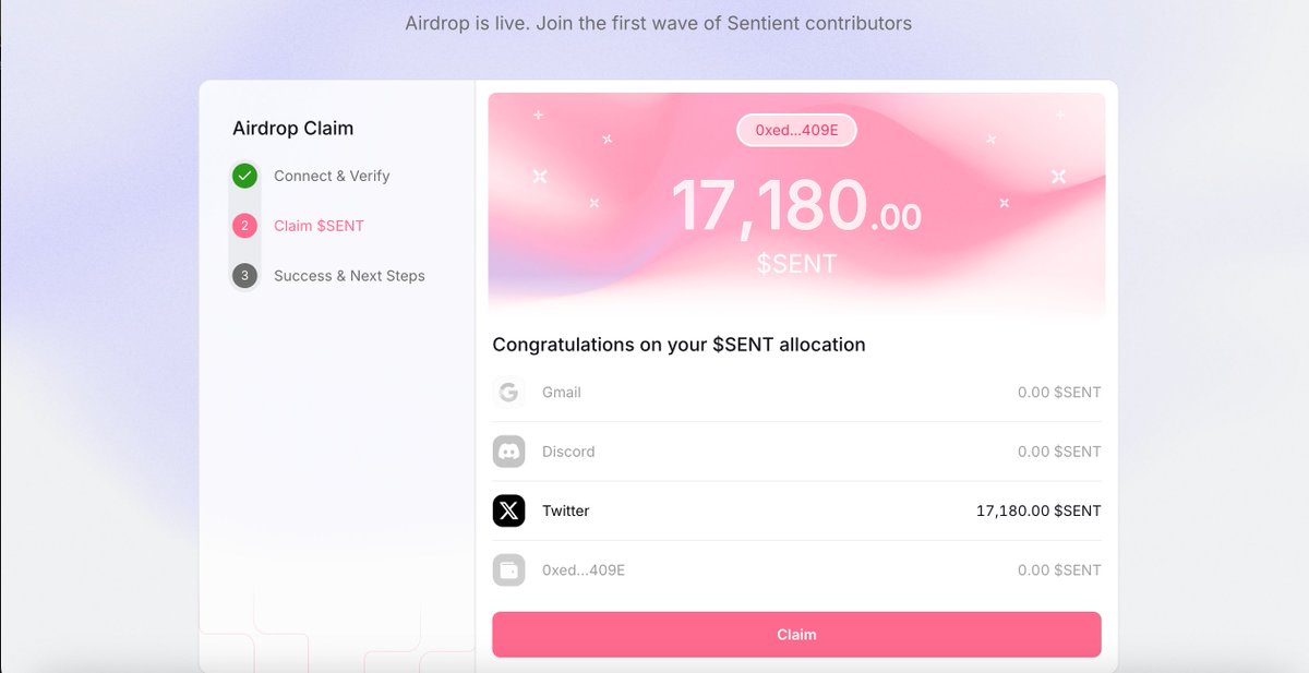 @SentientAGI 19号下午 8 点到 10 点上 @binancezh 钱包第 4 期 Prime 打新,根据项目方昨天发布的代币经济学,这部分不超过 2%