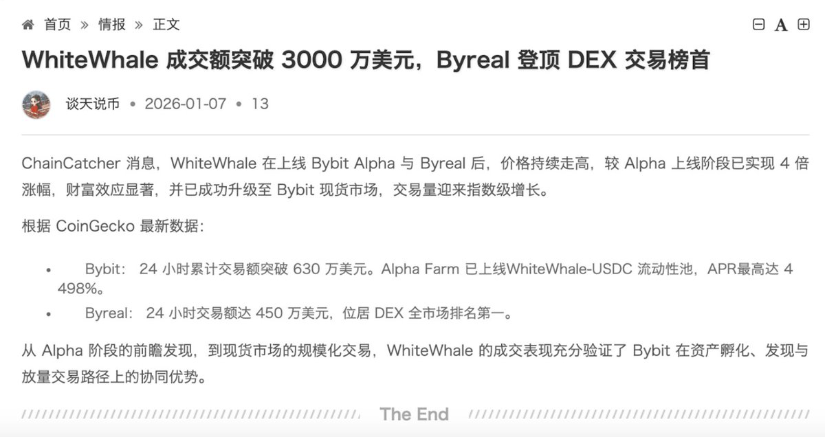 另外看了下社区类 meme $WHITEWHALE 登陆 Bybit Alpha + Byreal 后交易量直接走出一根大阳线,交易量简直是原地起飞,前两天热门 $FIGHT 买盘也验证流动性
