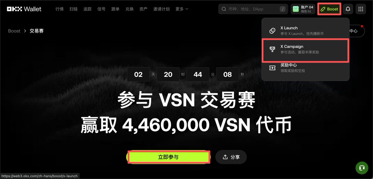 错过 X Launch 的,不妨看看 X Campaign 这边的机会。 OKX 钱包 x VSN 这次拿了 446 万枚 $VSN 出来搞交易赛,看了一眼时间,活动还剩 4 天