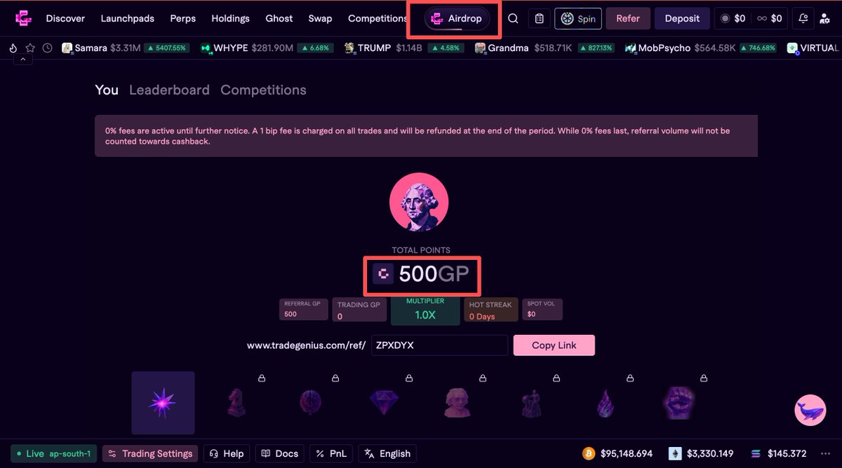 目前注册空投 500GP 积分,如果遇到注册无法加载试试换 HK 的节点,注册后可以点击 Airdrop 板块查看积分