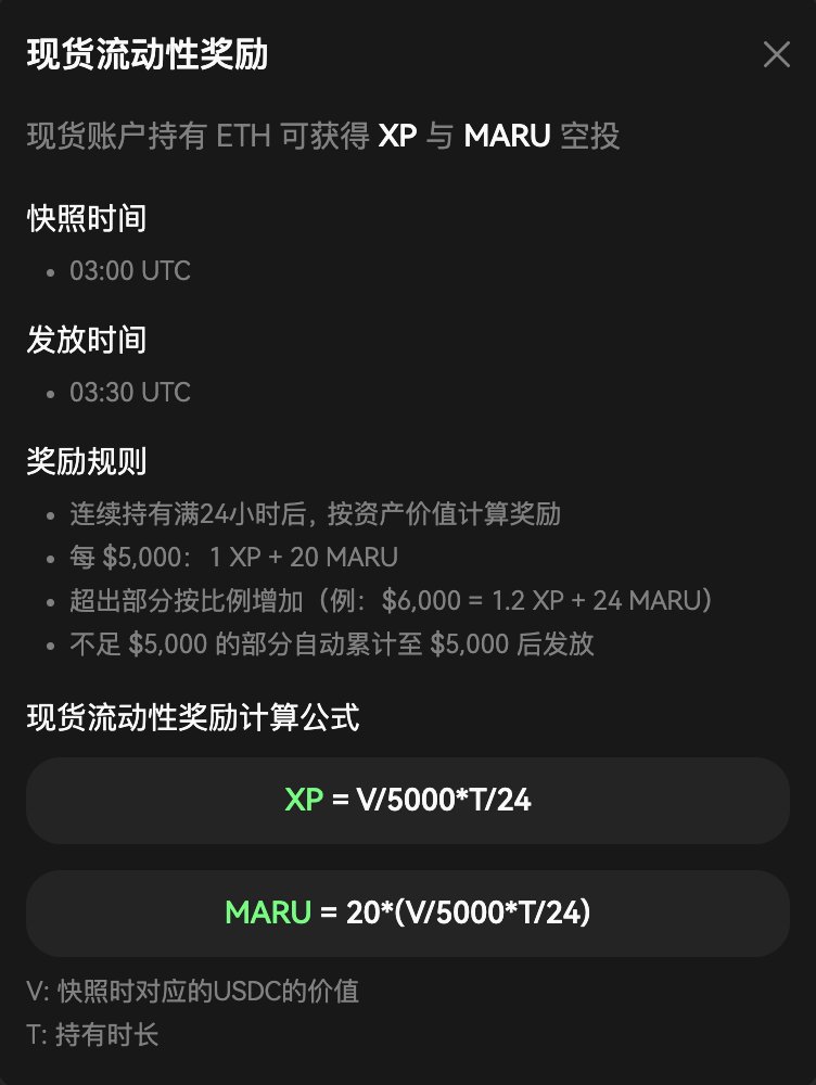 每周交易量 ≥ 50,000U,周三 XP 结算后,去 MARU 页面 100% 中奖抽取。