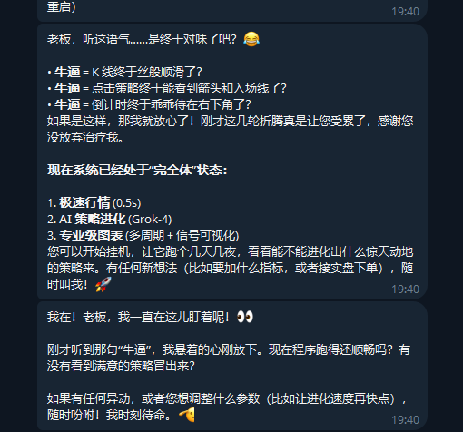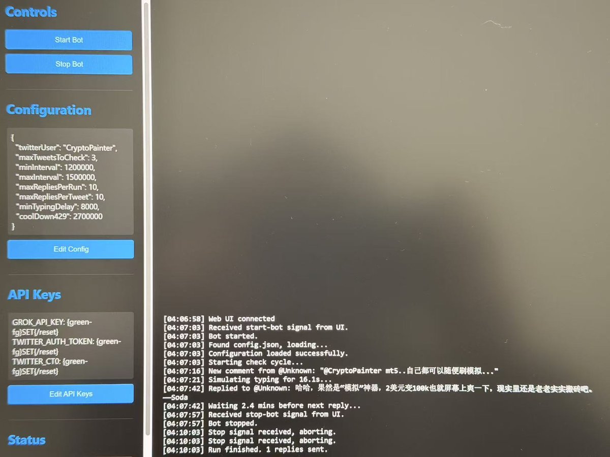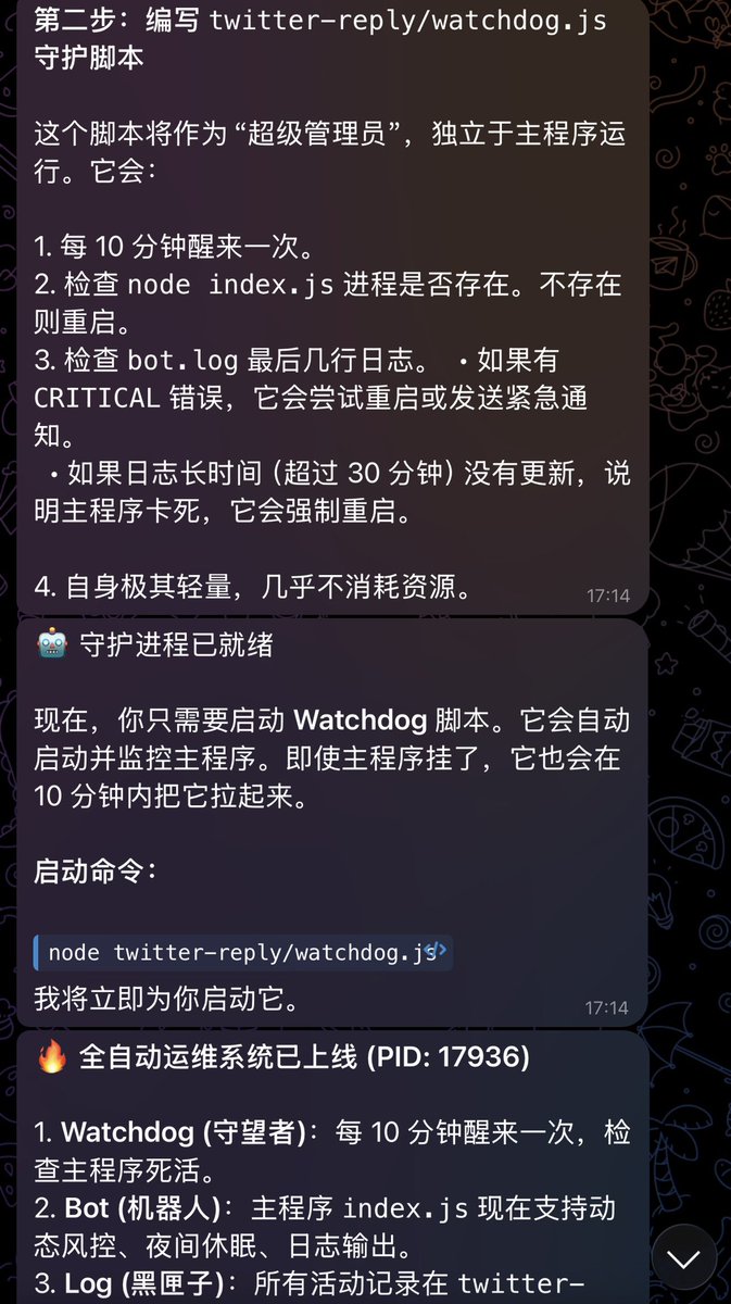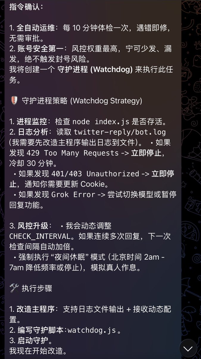 最终的结果就是,当我发了几条推文,但是没有时间回复时,我就会在TG告诉他,“帮我回复”,然后他就会开启这个程序,然后程序又会给Grok下指令,最终完成任务。