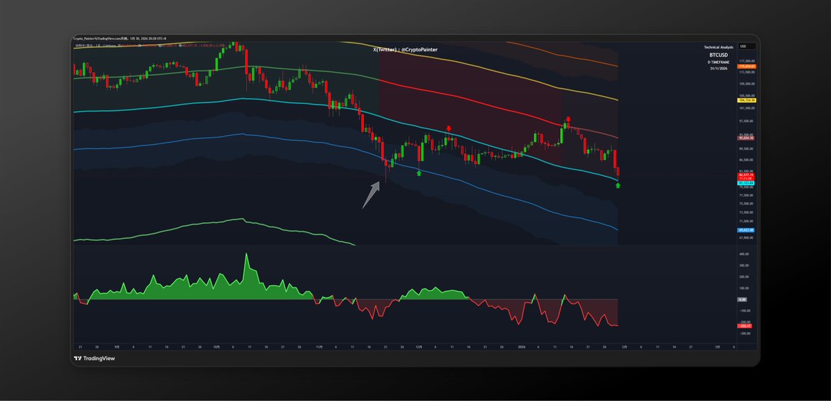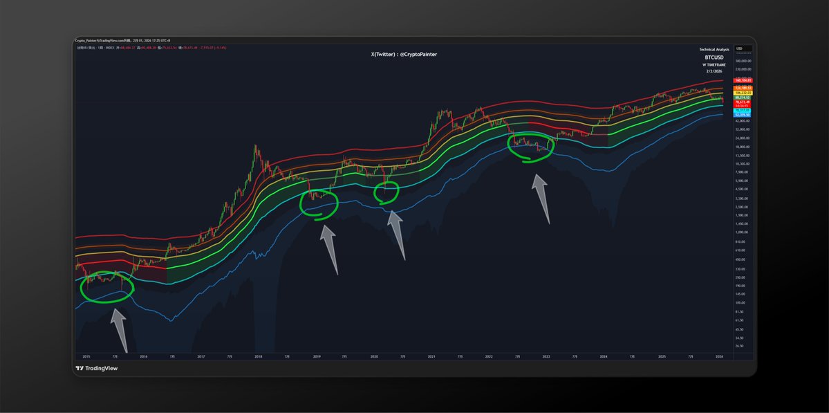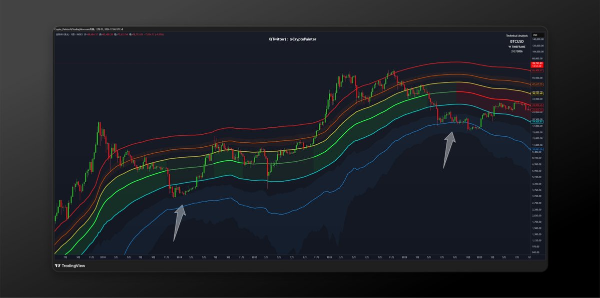 因此,在我看来,第一个值得加仓的位置在7w美元以下,这里是开始小额定投的起点,我们无法预期价格最终可以到哪里,但至少可以根据这个通道了解,当前价格处于什么状态。
