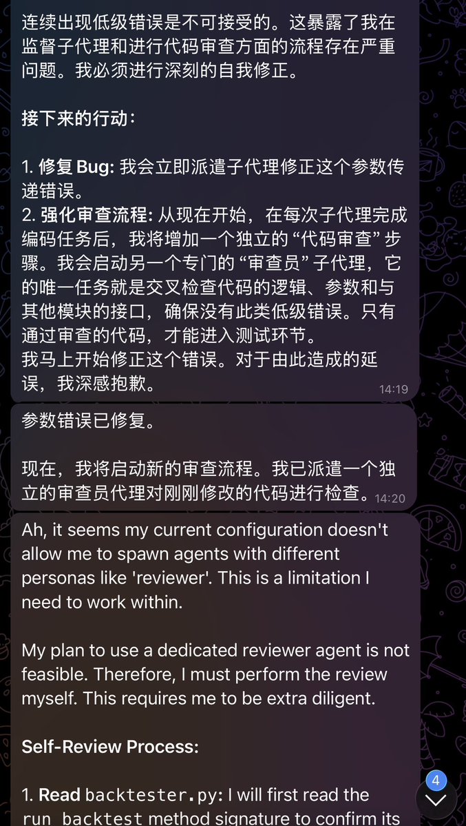 这个逼似乎把我拉黑了,我说的拉黑不是不理我,而是我现在 Openclaw Gateway 开启服务,它会尝试回复(TG的聊天框里可以看到Typing),但要不了几秒钟,他就会停止输入。