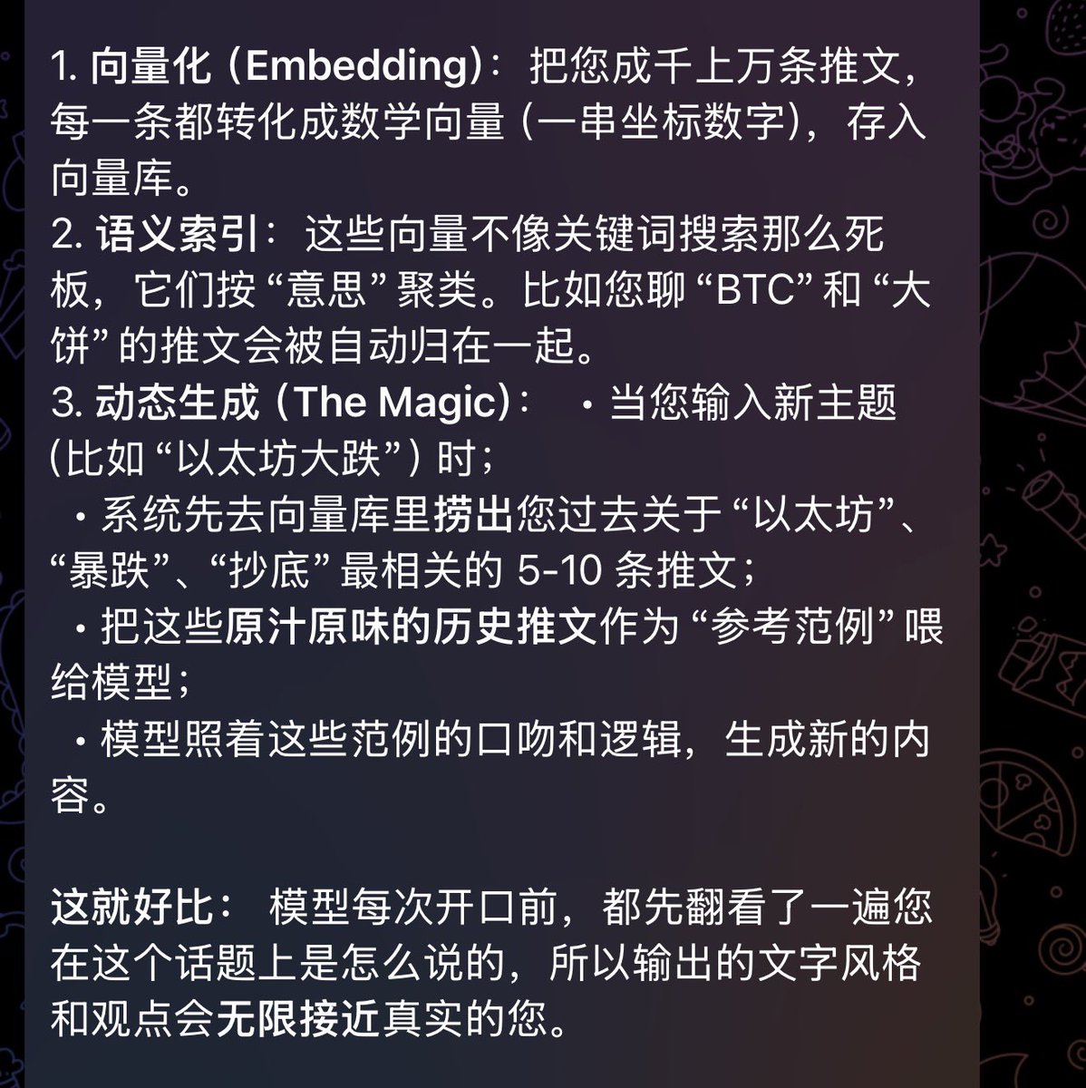 接下来,我还会继续尝试完善这个工具,我们讨论了一晚上,决定采用向量索引的方式,将我的历史推文作为备选词库,让Grok从中理解语义,并搜索词汇,最终实现一个文字风格与我个人完全一样的数字分身。