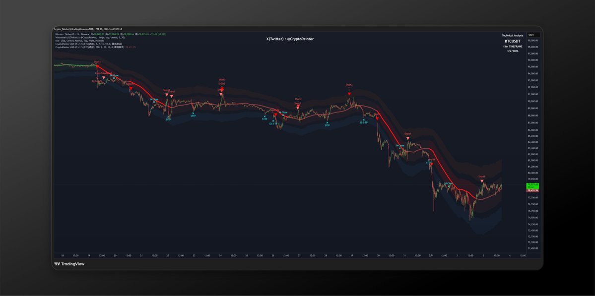 目前我刚刚完成了和 TradingView 同级别的K线显示系统,并加入了持仓、交易标记等功能。