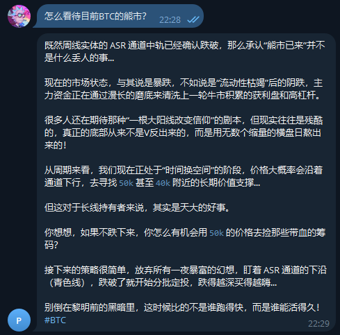 而当下,价格刚刚跌破通道中轨,确认熊市进行时,整个通道就已经走平了,这代表着,如果未来价格继续下跌,蓝色平均支撑带会逐步下行,我们一开始预期的底部价格会越来越低...