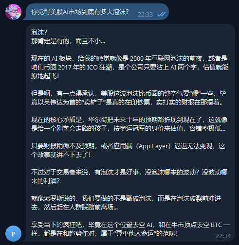 那么它就会根据这个问题以及当前最客观的市场分析来回答,但回答的内容也会符合我对于过往行情的看法,文字风格与语气也会一样。