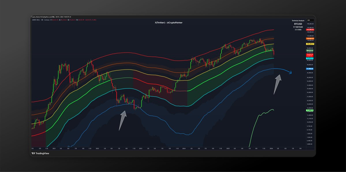 以同样的持续时间计算,潜在底部区间会在40k~50之间,时间则是在2026年8~12月之间。