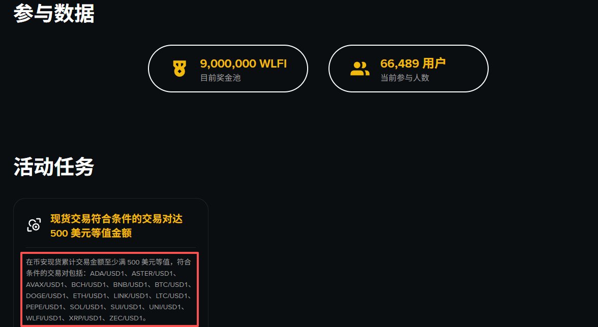 累计交易至少500美元的USD1现货交易对,即可赚取12至72 WLFI代币券,仅限前75,000名用户。