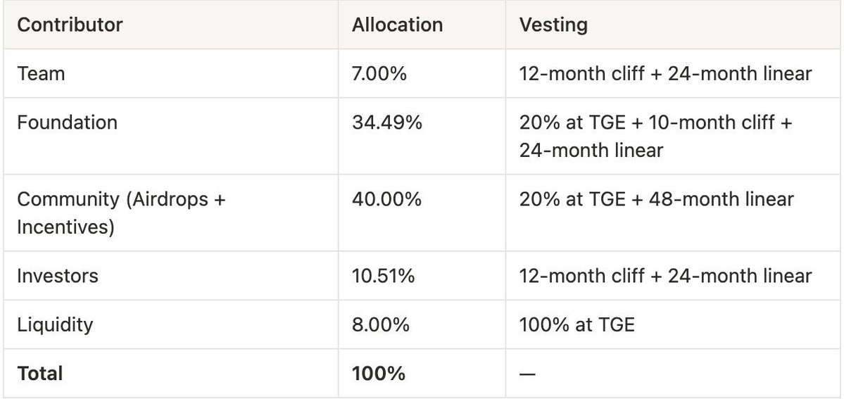 核心贡献者 34%(TGE解锁0%,12个月锁,4年线性释放)