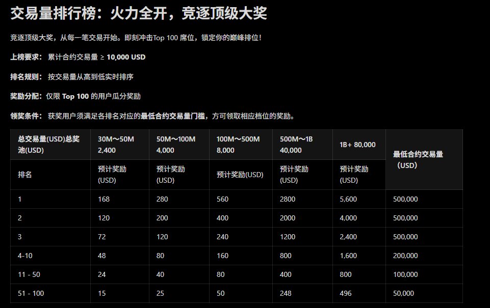 关于活动奖池采用动态奖池机制,奖池跟着所有参赛者的合约交易量一档一档解锁,最高到十万美金。