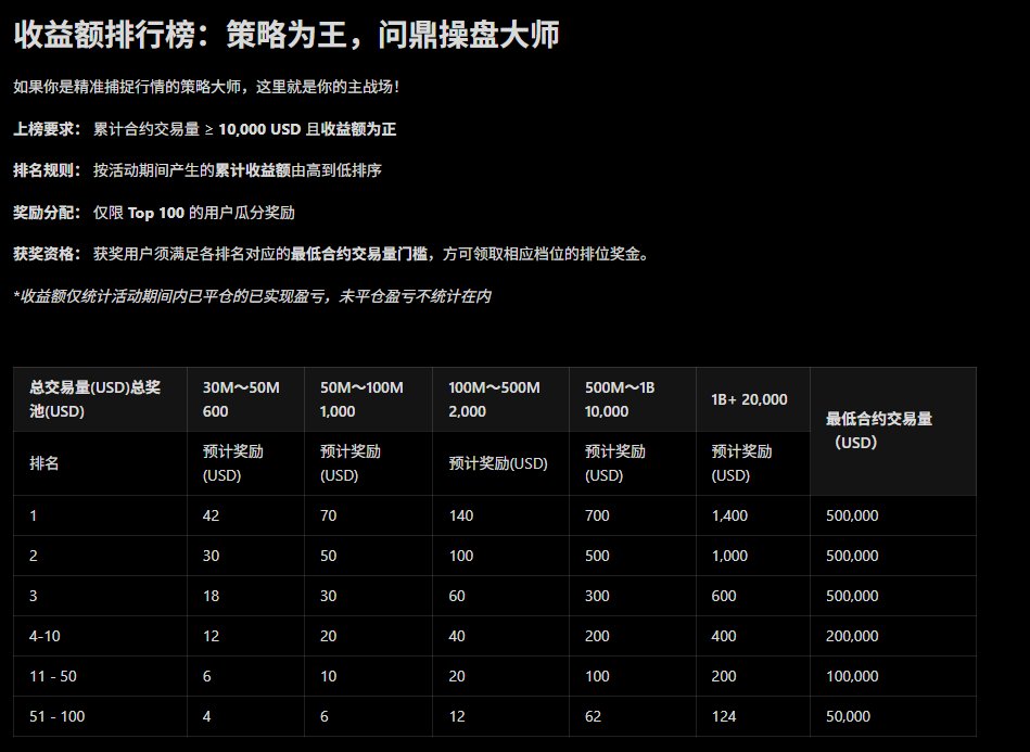 两个榜单的上榜要求都是合约交易量 ≥ 10,000 即可,不过收益榜要求收益额为正。