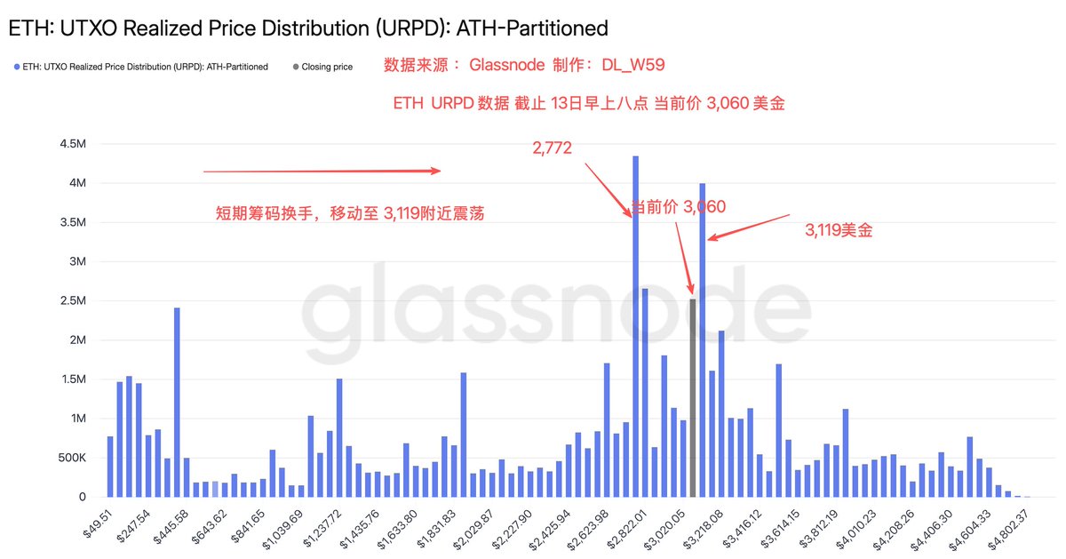 当前单一价格巨量筹码柱子仍然是2,772美金。周一的换手也不高。还是短期持有者如2,920-3,060区间参与换手,继续在3,120美金左右的浮动。