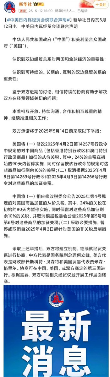 2,双方加征的24%对等关税措施暂停一年;(之前每次谈判都是延期90天,这一次直接就是延期一年,太超预期了)