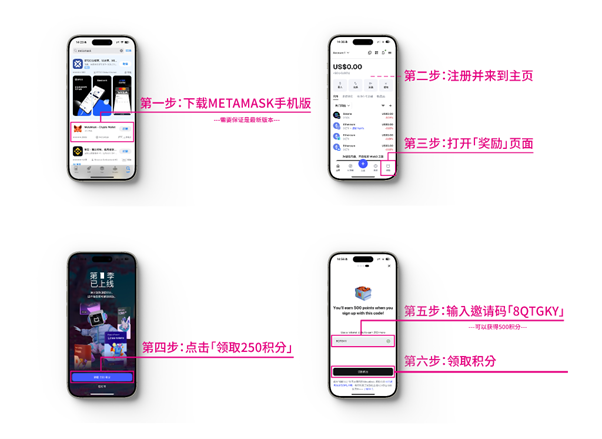 在App内加入奖励计划:打开MetaMask App,进入“奖励”或“活动”页面,最右下角手动加入,填入邀请码:8QTGKY 获得500积分