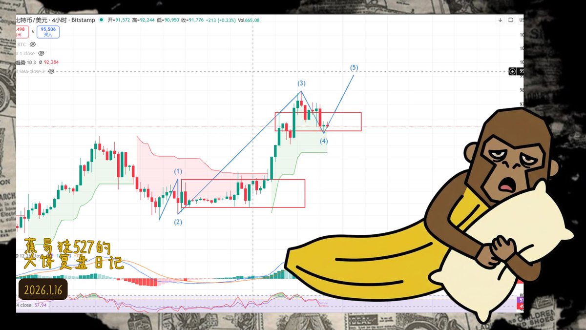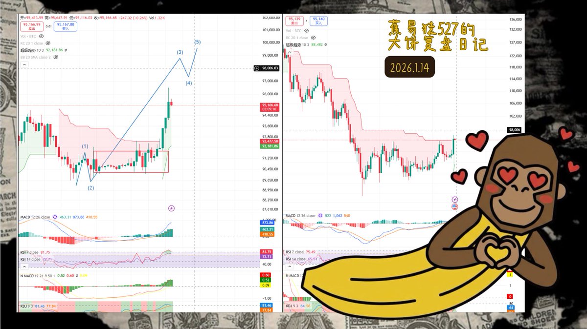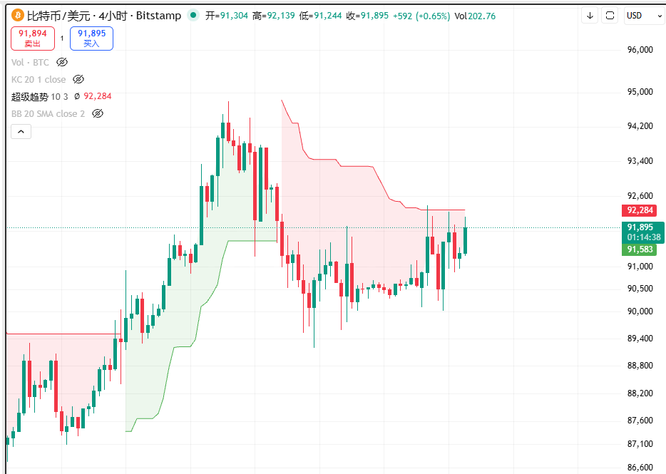 目前4小时还运行在上升3浪中,只出现了一个分歧区,今天估计会出现第二个分歧区,且走且看。日线级别突破了超级趋势,这是 3 浪确认的信号。按照常规,突破后会有回踩确认,等这波 4 小时行情结束后再行跟踪。
