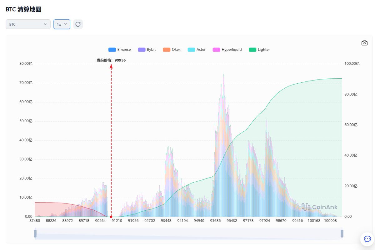 ❚ 清算图, $BTC 已经堆了 100 亿的多单待清算了;