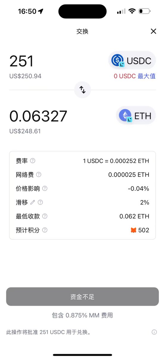 🔸给钱包的LINEA链充值251USDC以及少量ETH做Gas