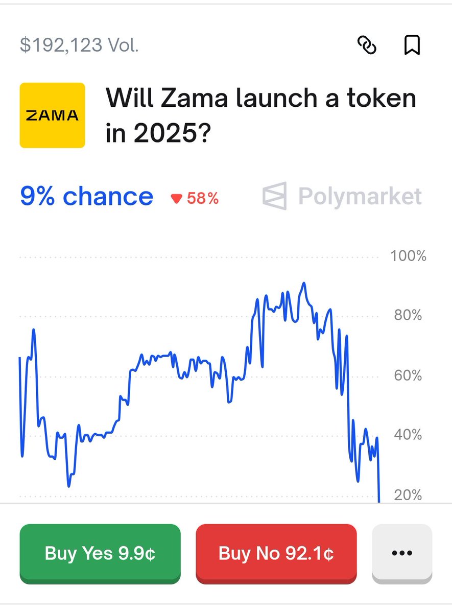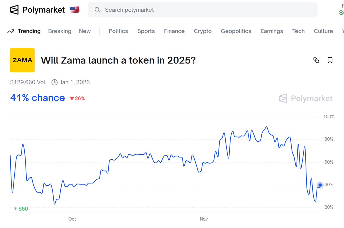 Polymarket上面Zama2025年发币的yes暴跌至41%?(图一)