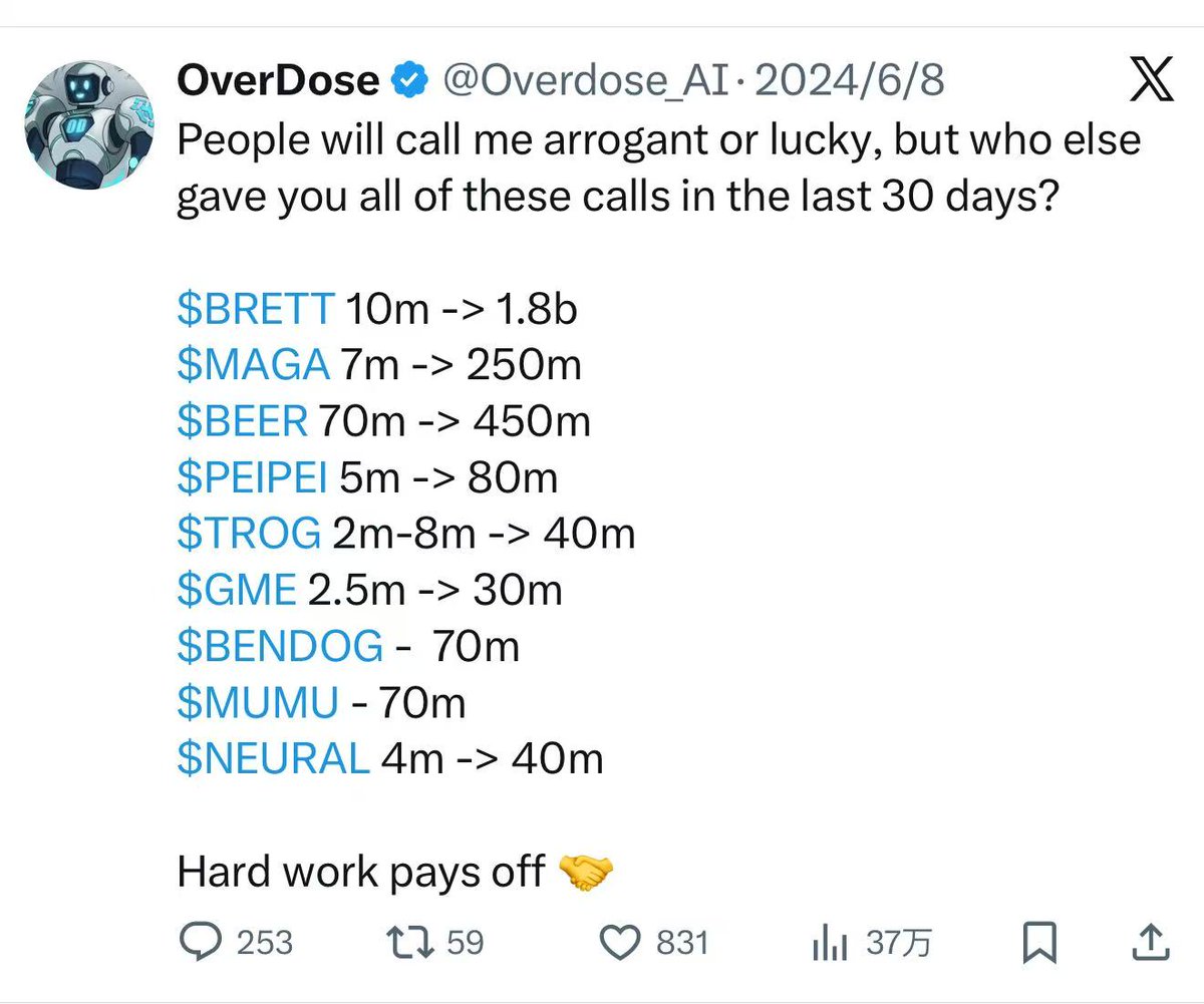 最近准备收集一些比较优秀的 Alpha Hunter账号,然后有老外朋友给我推荐了@Overdose_AI(OD)