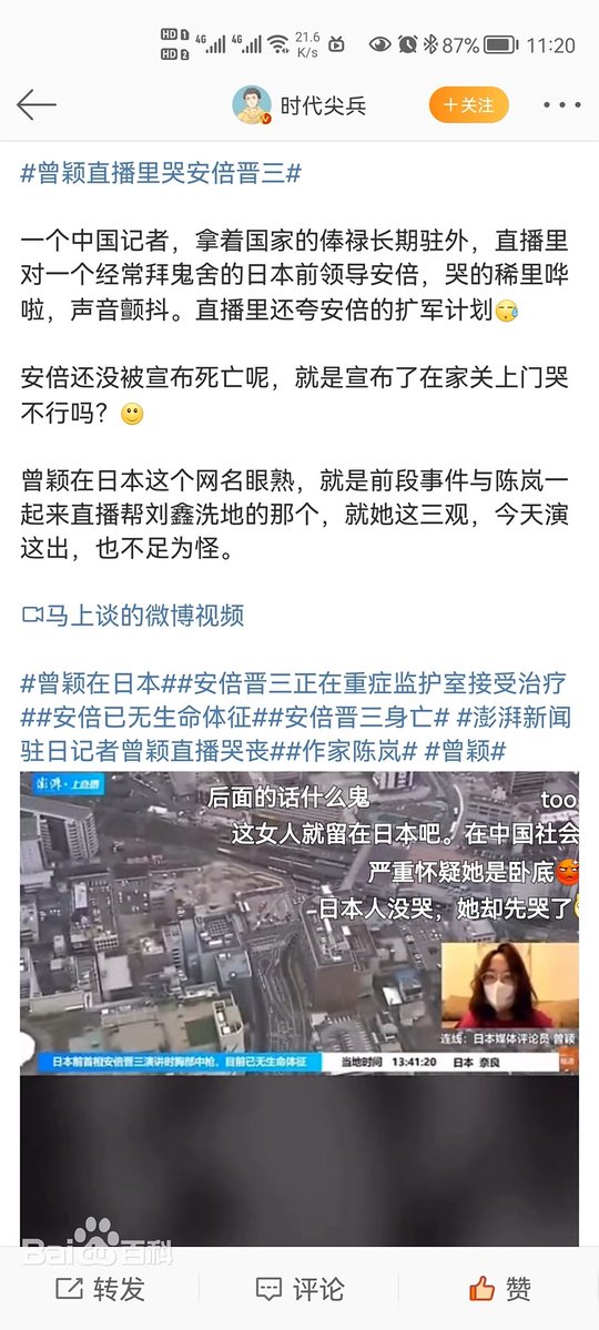 本来不想趟这个浑水,我才知道这个曾颖原来是长期驻日那个哭安倍晋三的女记者,然后炒作自杀。