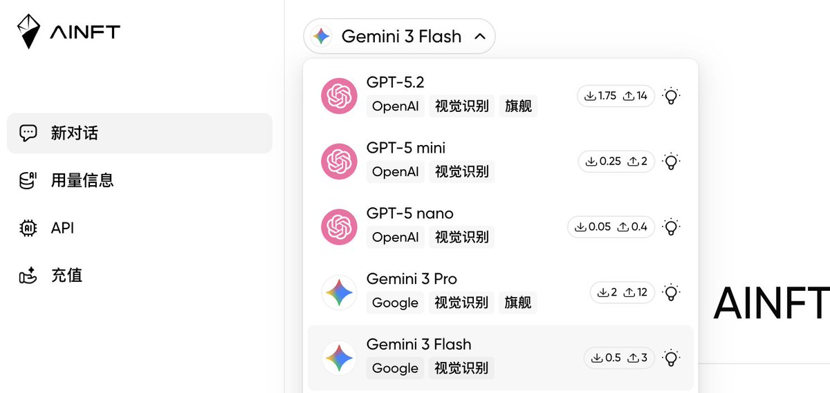 1️⃣ 打破“围墙花园”,一站式集成顶尖算力不再需要为 ChatGPT-5、Claude 4.5 或 Gemini 3 分别订阅会员。AINFT 整合了行业领先的 LLM 集群,开发者和创作者可以通过一个入口,根据任务需求灵活切换最适合的模型。