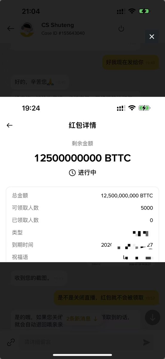 于是紧急让冠军关了直播间,第一时间去找了客服和滢哥,她们也第一时间说红包无人领的情况24小时退回,回复很及时!
