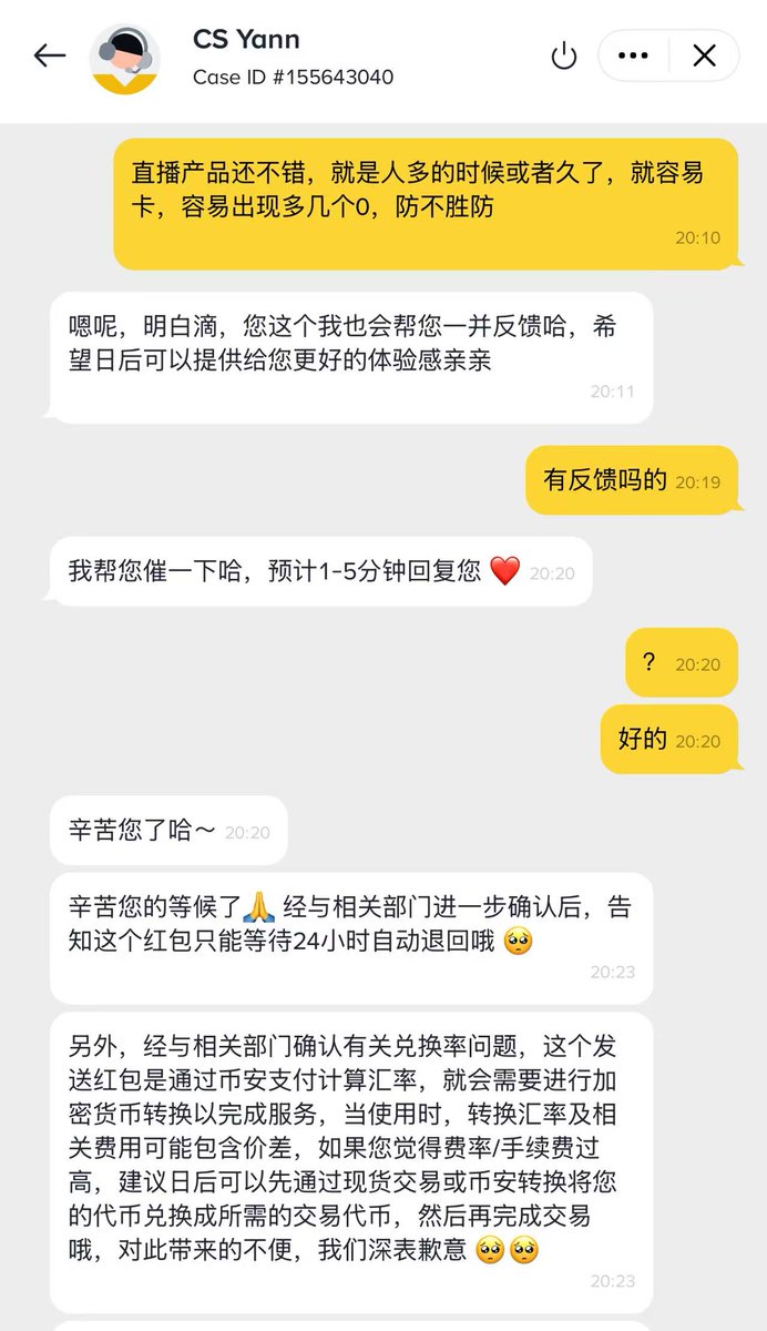 感谢币安好员工,广场最好的负责人滢哥 @yingbinance ,很耐心的反馈,直播间卡顿发错的红包退回了!