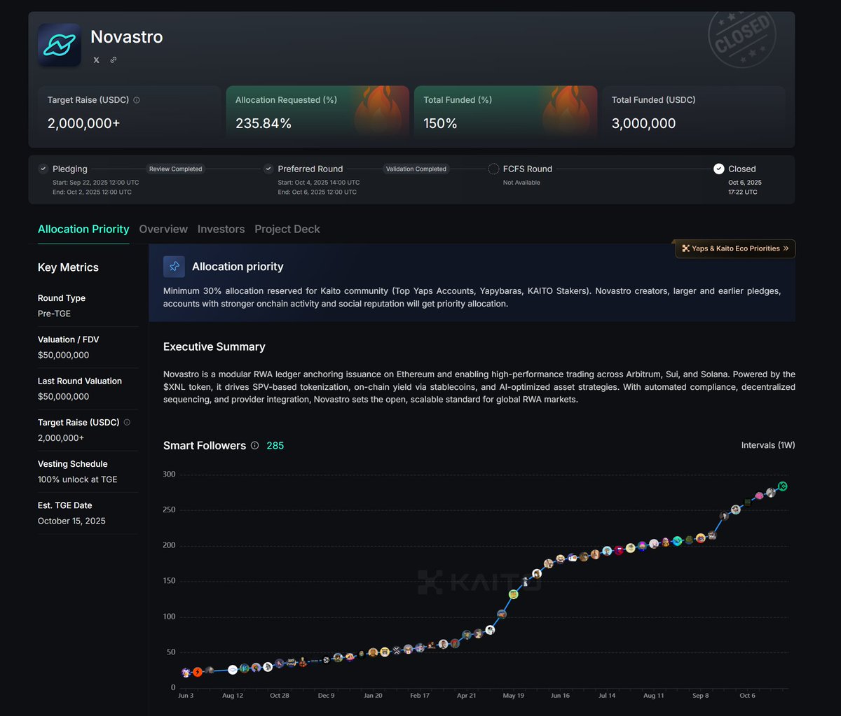 @KaitoAI Launchpad 公募的 @Novastro_xyz,估值 $50M、募资 $2M,超募 235%。