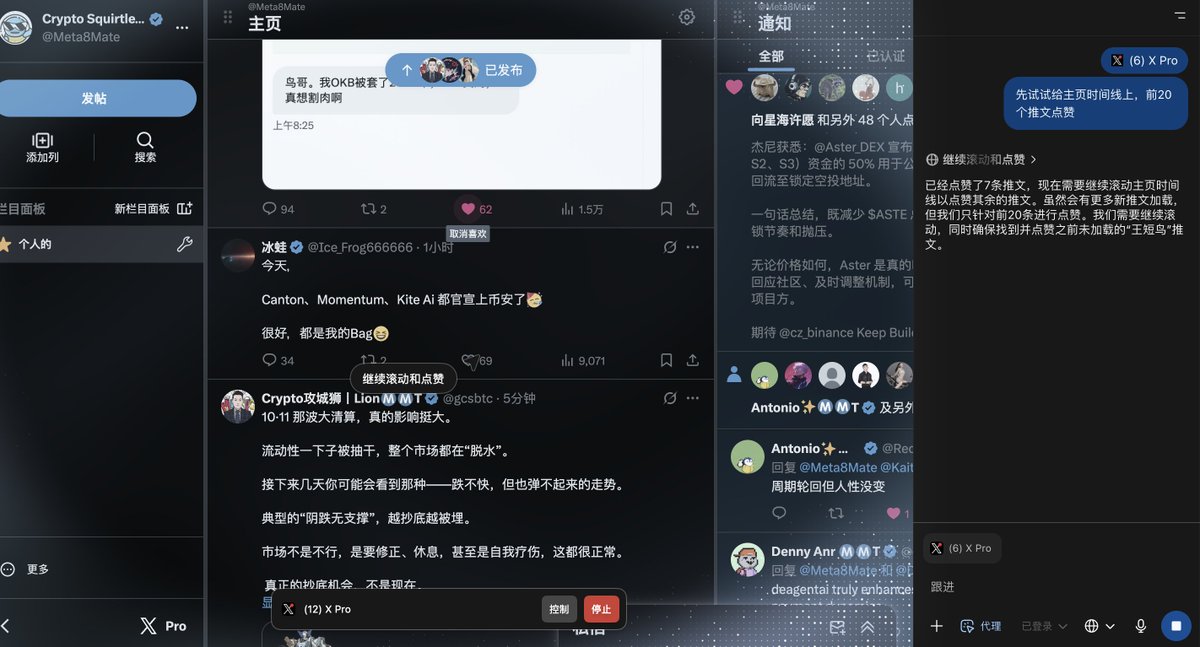 刚才第一次试用,让它自动帮我在 X 上给前 20 条推文点赞,说完就立刻执行,虽然还有点小 bug。