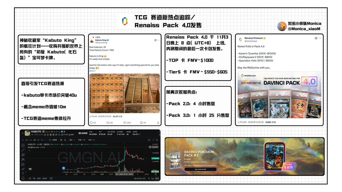 我看好 TCG 赛道的原因在于它既有 Web2 的收藏积淀,又有 Web3 喜欢的波动性。Kabuto King 证明了这张牌可以打响,而Renaiss这样的 TCG RWA 的使命,就是将这种原始的冲动规范化、金融化。