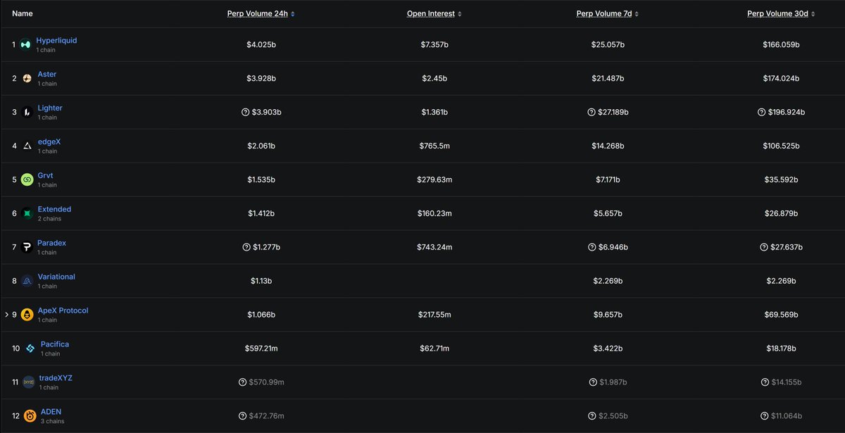 截至 2025 年 12 月底,永续 DEX 市场已形成以 Hyperliquid 为首的 CLOB(中央限价订单簿)模式主导格局,占据约 70-75% 市场份额。AMM 模式则更多退守长尾资产和零售友好市场。