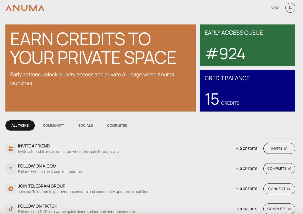 现在 Anuma 已经开放早期 waitlist,不用等邮件通知,直接就可以进入官网,做简单任务和邀请朋友,赚取 AI Credits(AI 积分)。积分会影响正式上线后的优先权和早期功能和福利。现在处于非常早期,感兴趣可以走我邀请