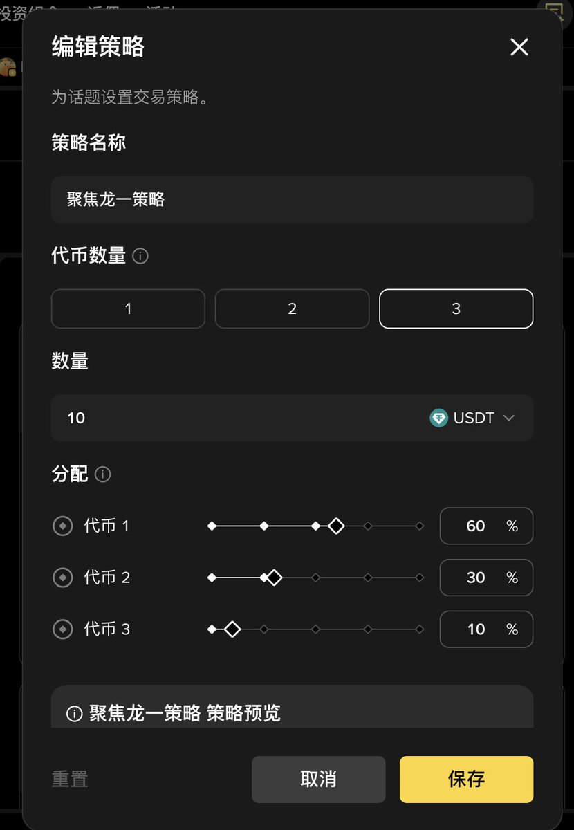 而且Topic Rush还提供了自定义策略来买热点的功能,这是一个我非常喜欢的功能,我们以前选币的时候,经常会遇到很多的同名币来分流,不知道买哪个好。Topic Rush可以配置不同的金额按比例一键来购买某个话题的代币。这样总不会错过龙头。
