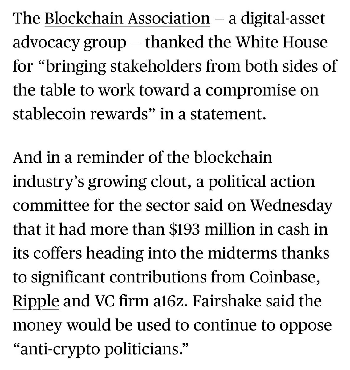 Crypto industry now wielding same type of power ($$) as traditional banking lobby has for decades.