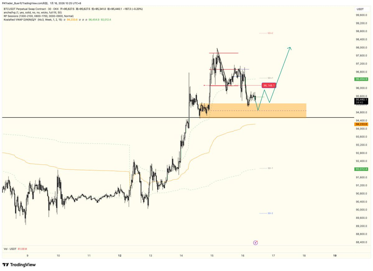 1)周线目前依然在80-96区间震荡 ,我们看到上方掠夺后, 下方回到了eq 下方也再次打到趋势线。