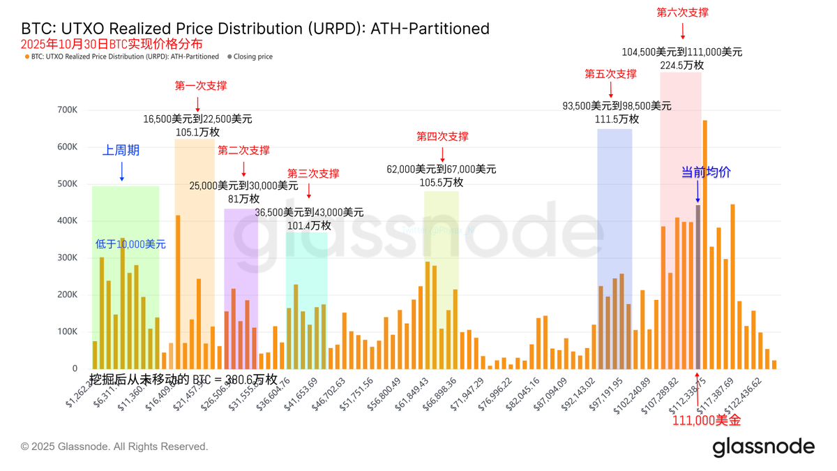 虽然短期投资者的情绪并不是很好,但筹码结构显示多数的投资者仍然是非常稳定的,104,500 美元到 111,000 美元之间的支撑也非常稳固,最近几次向下插针都显示出了这个位置的强度。