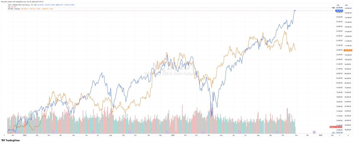 今天的作业难度更大了,晚上美股开盘后 $BTC 的价格就在一路下行,而美股本身的走势还是不错的,即便是美联储公布了降息25个基点并且准备在12月停止缩表,也没有让 Bitcoin 的下跌停止,我查了一些数据和信息并未发现有利空的内容,第一个想法就是美股尤其是科技股在吸取更多的流动性。