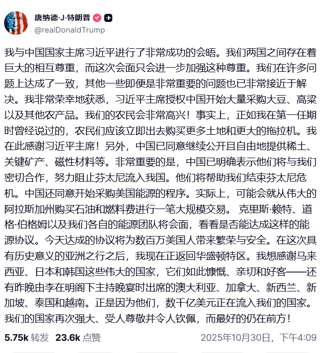 并且川普表示按1到10分的标准,和习近平的会面是12分。总的来说这次的会面应该是实现了预期,而且11月1日给中国 100% 的关税也没有了,短期来说中美的关系还是缓和的。